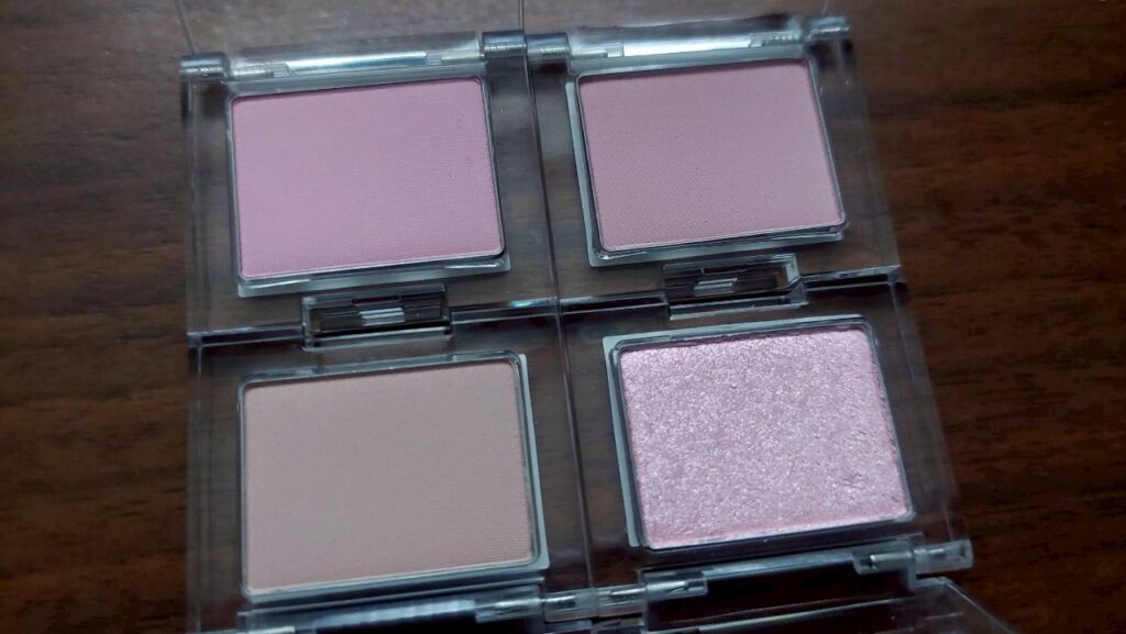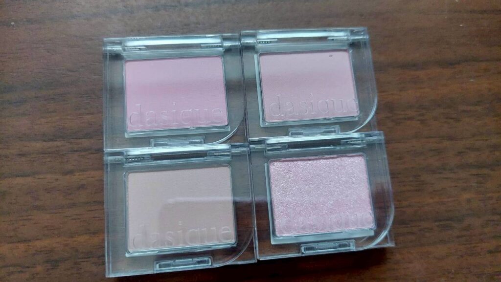 今回のdasique祭りの目玉、単色シャドウです。発売をずっと楽しみにしてた。ブルベ向きのカラーがピンクの色展開がすごく多くてめちゃくちゃ迷った。今回はまず間違いなくBright Summerに似合うであろうクリームベリー、本来くすみ系はあまり得意ではないものの、前回HOLIKAHOLIKAの単色シャドウで意外とくすみ系が刺さった経験から選んだアッシュヌード、ピンク系ばかり持っててブルベ向きのブラウンを全く持ってなかったので選んでみたミューテッドベージュ、最後にピンク系のラメほしいなと思って選んだベールピンクという選抜です。